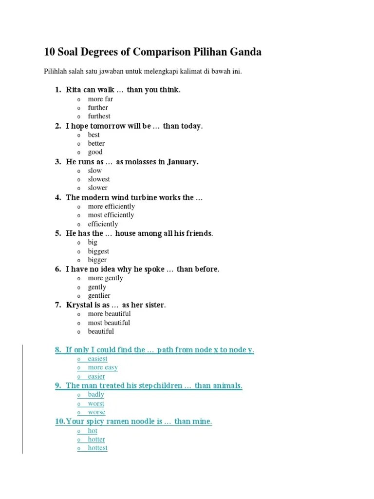 Tepatnya di awal bulan desember akan dilaksanakan ulangan akhir semester (uas). Positive degree adalah salah satu dari 3 jenis degrees of comparison yang menunjukan perbandingan yang sama derajatnya antara adjective atau adverb. Do + subyek + verb ? Berikut ini adalah beberapa soal adverb of manner yang sering kita temukan baik di sekolah maupun di tempat kursus bahasa inggris. Adjective (kata sifat) · 5.